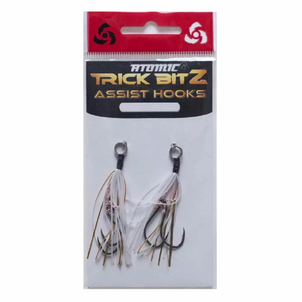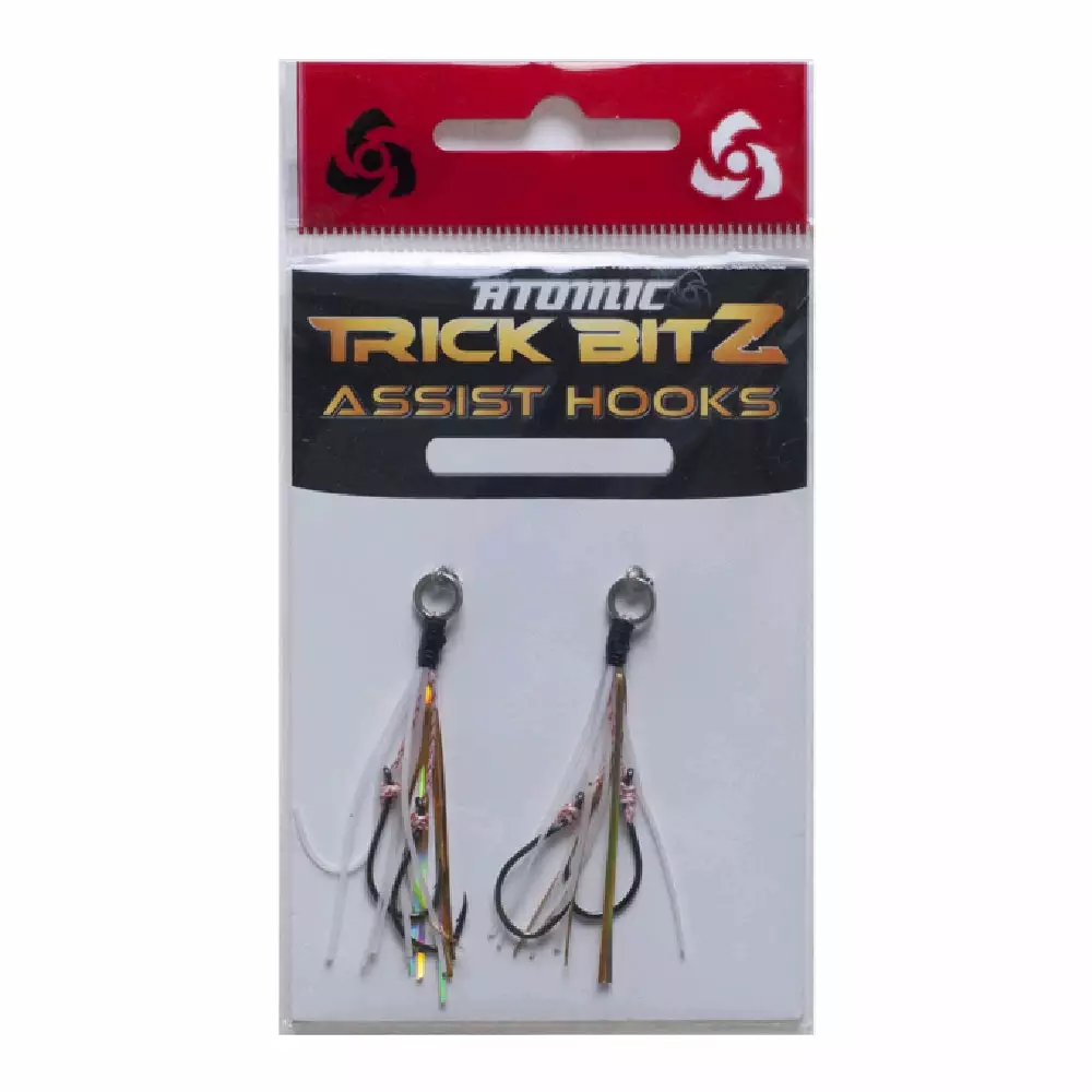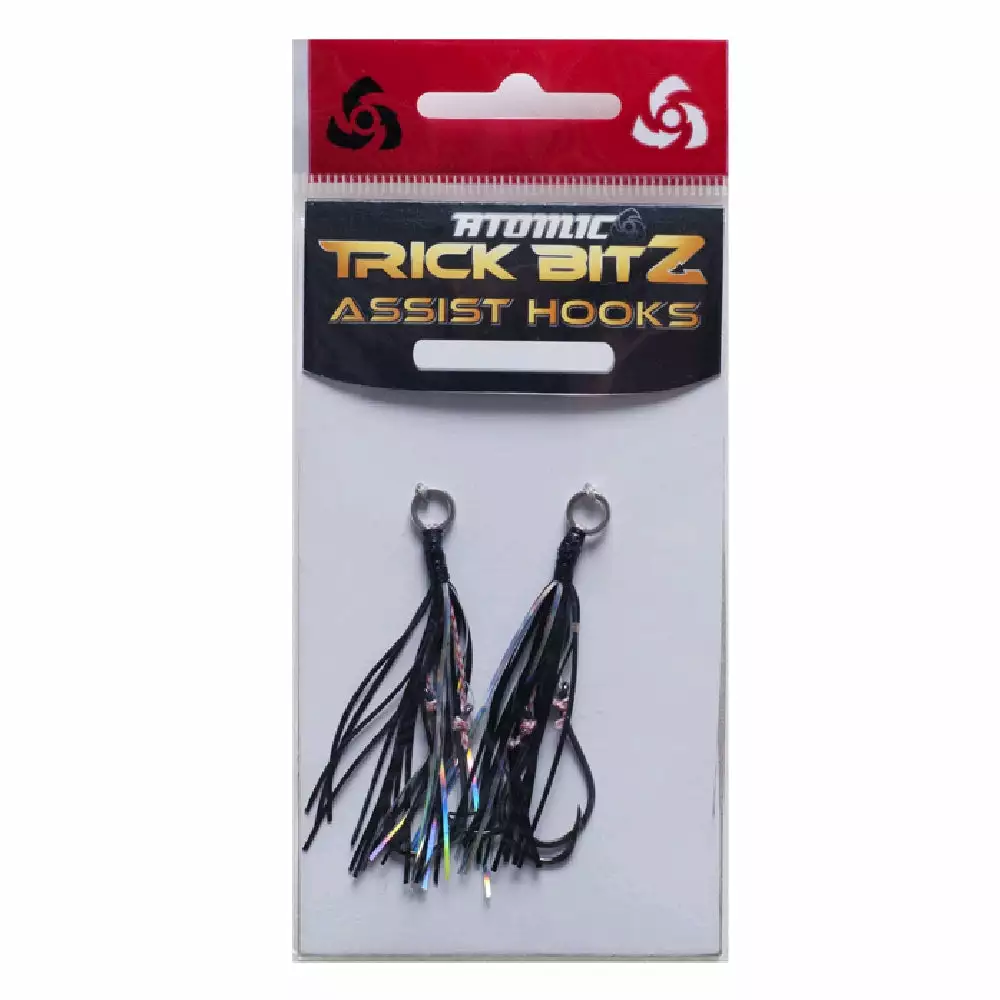 Looking to take your lure to the next level with added appeal and flash,then the Atomic Assist Hooks is what the doctor ordered. The perfect addition to your favourite surface or trolling lure, or almost any lure for that matter, these eye-catching lure additions feature coloured skirts and flash material, and are made using only the finest hardware, including strong, nickel-plated hooks and fail safe ultra secure split rings.