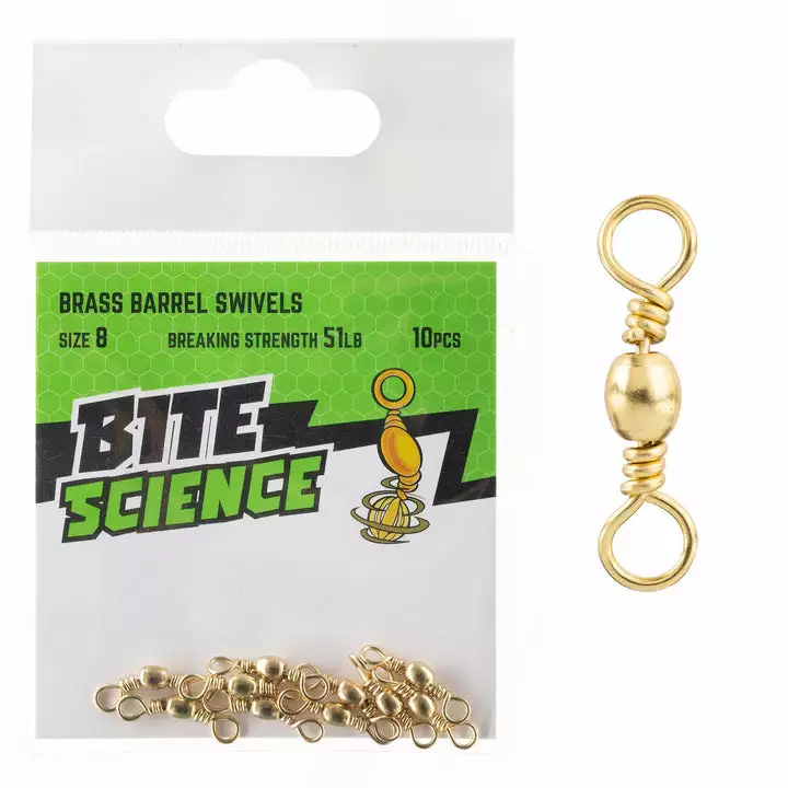 Bite Science Brass Barrel Swivels are a classic and popular light-tackle option for line-to-line and line-to-leader connections. Also used for setting up float and running sinker rigs. They reduce line twist and are of heavy-duty construction. They can be used to make your own pre-rigged wire traces.