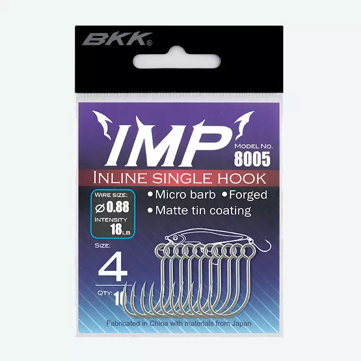 The BKK Single Inline IMP hook is a great single option for finesse and light fishing applications.The micro barb on the Inline IMP ensures a strong hook up rate, and also reduces any damage to the fish which is beneficial for those practising catch and release. The hook itself features a needle-like hook point and has been finished with a matte tin coating, so you won’t have to worry about rust after one session on the water. A great option for fishos who want to upgrade their lures to single hooks.