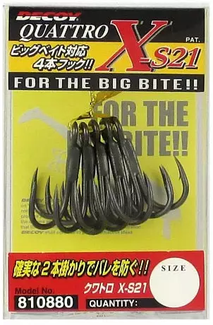 Built using a thick wire construction, the Decoy Quattro X-S21 Hook delivers excellent hook sets and increased holding power for those extra large fish. Built with four hook points versus the traditional three, the Decoy Quattro X-S21 Hook works well as a replacement for stock hooks on bigger crankbaits, jerkbaits and topwaters. The Decoy Quattro X-S21 Hook is also well-suited for line-thru swimbaits because you can bury one hook into the body of the bait and still have three hook points exposed. Quietly used by many professional anglers, the Decoy Quattro X-S21 Hook offers a great way to replace stock hooks when targeting tournament-winning fish.