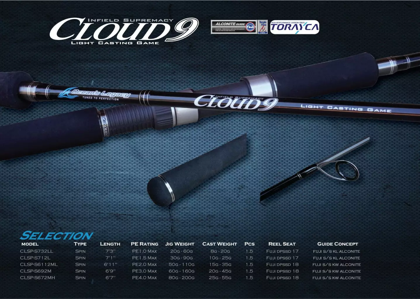 | CLSP-S712L | Spin | 7’1″ | PE 1.5 Max | 10G – 25G | 1.5 | Fuji DPS17 | Fuji S/S KL Alconite |