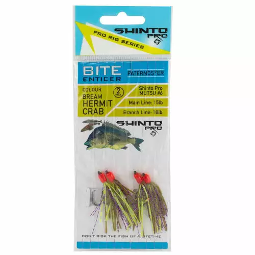 The Shinto Pro Bite Enticer Paternoster Mutsu Circle Rig is versatile and allows you to present a lot of different baits that Bream, Flathead, Mullet, Trevally and other estuary and beach dwelling species. The best baits to use in conjunction with these rigs include molluscs such as pipis/cockles, squid and worms. The added dressing on the hook provides flash movement proven to attract fish. Set up is about as simple and easy as it gets. Tie the mainline to the Shinto Pro Bite Enticer Paternoster Mutsu Circle Rig swivel, attach a sinker to the sinker loop at the bottom of the rig, add fresh bait and you are fishing! It couldn’t be easier. The Shinto Pro Bite Enticer Paternoster Mutsu Circle Rig is most effective for targeting Bream but can be used to catch a variety of other species.