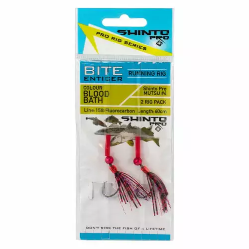 The Shinto Pro Bite Enticer Running Mutsu Circle Rig is versatile and allows you to present a lot of different baits that Whiting, Bream, Flathead, Mullet, Trevally and other estuary and beach dwelling species. The best baits to use in conjunction with these rigs include molluscs such as pipis/cockles, squid and worms. The added dressing on the hook provides flash movement proven to attract fish. Set up is about as simple and easy as it gets. Thread a running sinker onto your main line, tie the mainline to the Shinto Pro Bite Enticer Running Carlisle Rig swivel, add fresh bait and you are fishing! It couldn’t be easier.